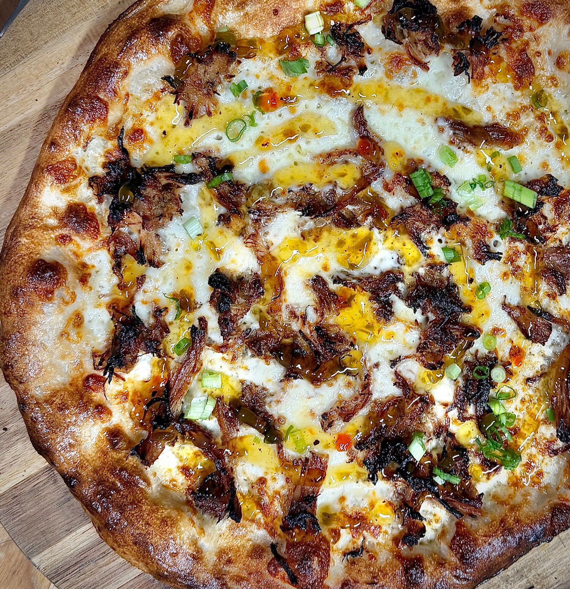 white pizza, mozzarella, pulled pork, topped with Green Chili Jam, and green onions